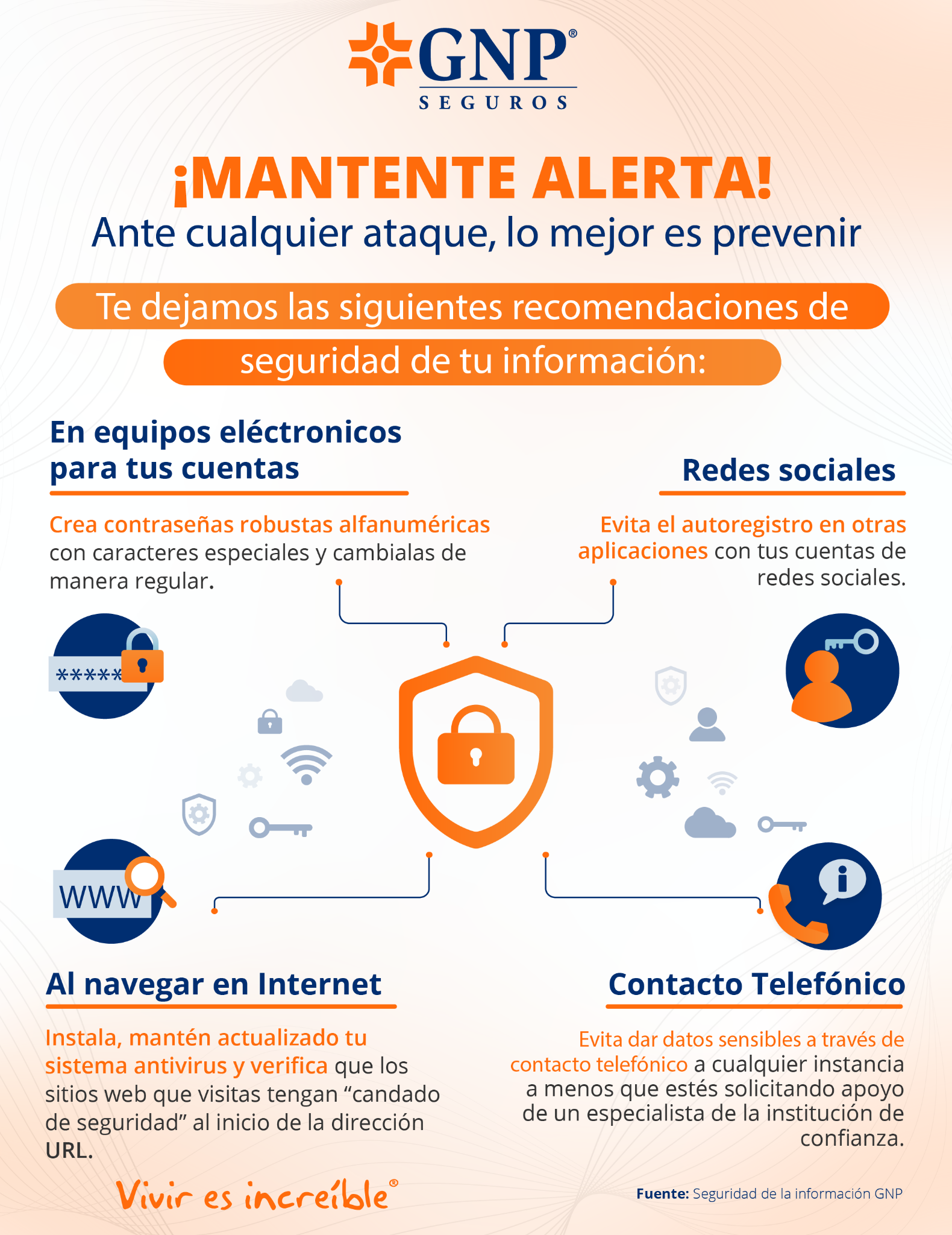 Es posible que estos números no sean los únicos que utilicen con este fin, así que ante cualquier solicitud de pago, transferencia bancaria u operación que te parezca sospechosa, valida previamente tus opciones de pago y fechas límite para realizarlos en los medios oficiales y seguros que te brinda tu Seguro GNP: