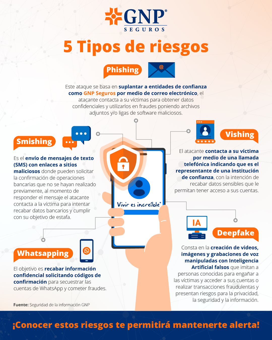 Para GNP Seguros la información clara es fundamental para la transparencia de nuestros procesos. Por ello, queremos compartirte que se han reportado casos de personas malintencionadas que suplantan la identidad de las líneas telefónicas en el identificador de llamadas con el uso de la tecnología, haciéndose pasar por representantes de GNP para pedir a clientes que realicen el pago de sus pólizas o renovación a través de transferencias a cuentas personales u ofreciendo alguna promoción.